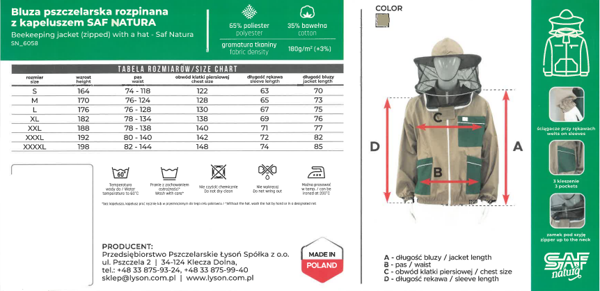 ⭐ Kombinezon pszczelarski z linii SAF Natura to połączenie bezpieczeństwa, wygody i profesjonalnego wyglądu. Zapewnia kompleksową ochronę całego ciała podczas pracy w pasiece. To rozwiązanie stworzone dla pszczelarzy, którzy oczekują maksymalnego bezpieczeństwa, funkcjonalności oraz komfortu użytkowania przez wiele sezonów. Idealny zarówno dla hobbystów, jak i zawodowych pszczelarzy.
