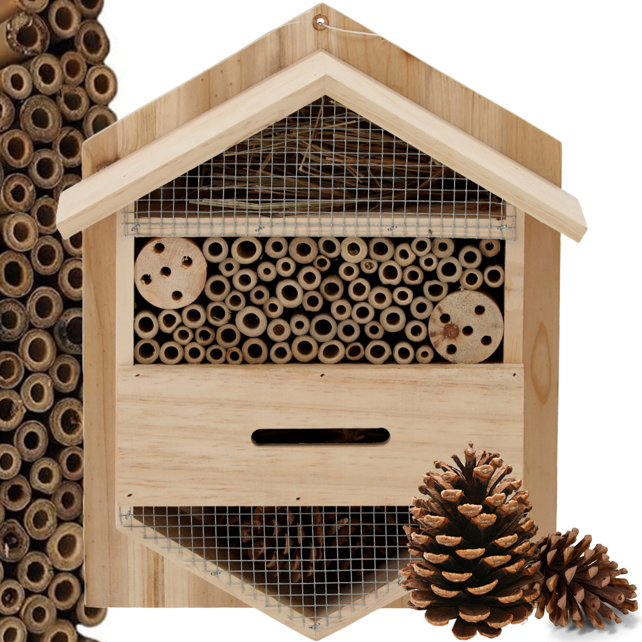 - domek jest wykonany z naturalnego materiału, który doskonale wpisuje się w potrzeby owadów zapylających - drewna, rurek bambusowych, kory, szyszek.