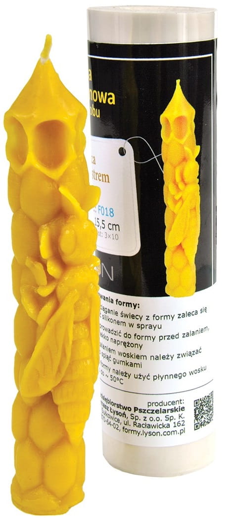 - Zalecenia użytkowania formy: aby ułatwić wyciąganie świecy z formy zaleca się spryskać formę silikonem w sprayu. Knot należy wprowadzić do formy przed zalaniem (powinien być lekko naprężony), formę przed zalaniem woskiem należy związać sznurkiem lub spiąć gumkami. Do zalewania formy należy użyć płynnego wosku podgrzanego do ~ 50°C.