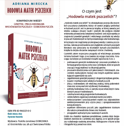 - Interesujesz się samodzielnym prowadzeniem wychowu matek pszczelich w swojej pasiece? Wiesz, jak uzyskać matki, ale nie wiesz jak pozyskać pożądane cechy? Jeśli tak, to książka Adriany Mireckiej „Hodowla matek pszczelich” jest właśnie dla Ciebie!