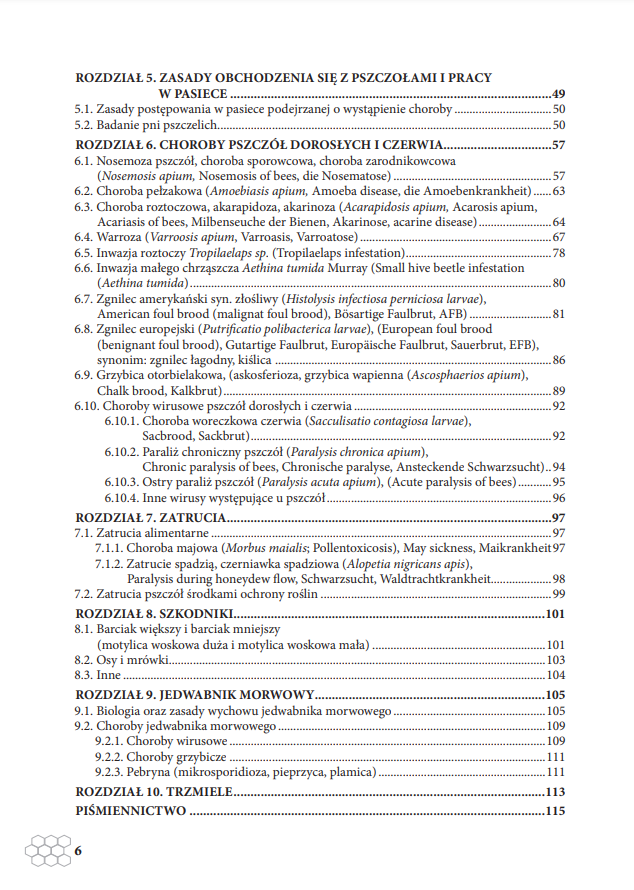 - Zawarte tu wiadomości o pszczołach, ich systematyce i rozmieszczeniu geograficznym, o produktach pszczelich, o anatomii i fizjologii pszczoły miodnej, a także strukturze pasieki i sezonowych pracach w pasiece pomogą zrozumieć mechanizmy patogenezy chorób, sposobów leczenia zasad doboru leków. Pomogą też w postępowaniu w pasiece podejrzanej o choroby i pasiece, w której znajdują się chore rodziny pszczele.