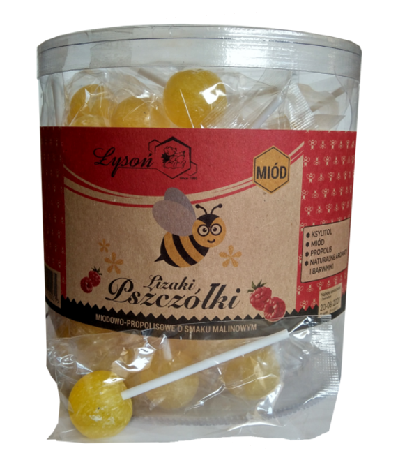 - Charakterystyka produktu: lizaki o smaku malin, miodu i propolisu, wytwarzane z naturalnych składników w których prym wiedzie miód wielokwiatowy, cukier brzozowy oraz propolis