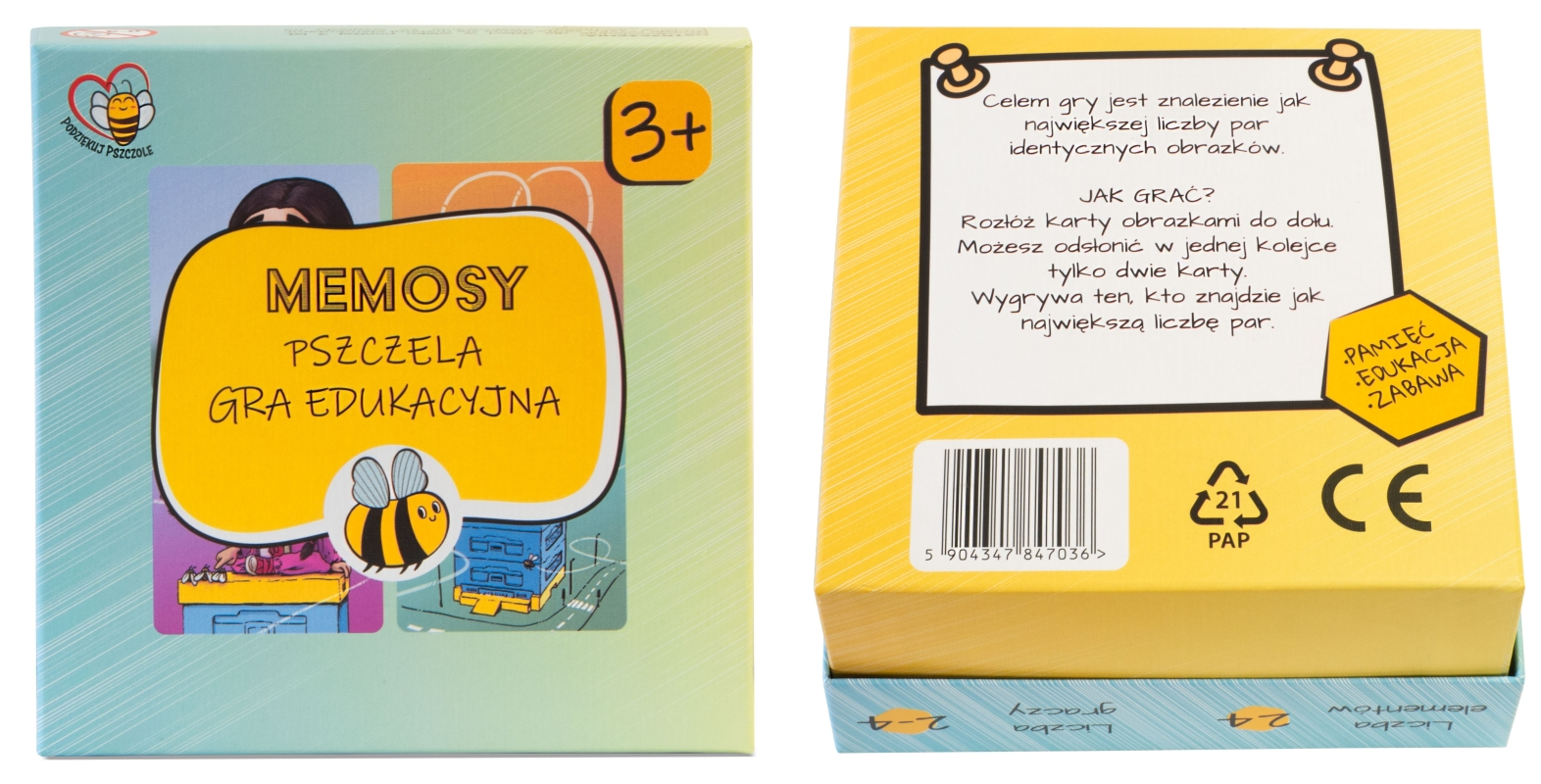 ✔️ Zestaw zawiera 24 karty, tworzące 12 par, z kolorowymi obrazkami przedstawiającymi różne aspekty życia pszczół i pracy pszczelarza.