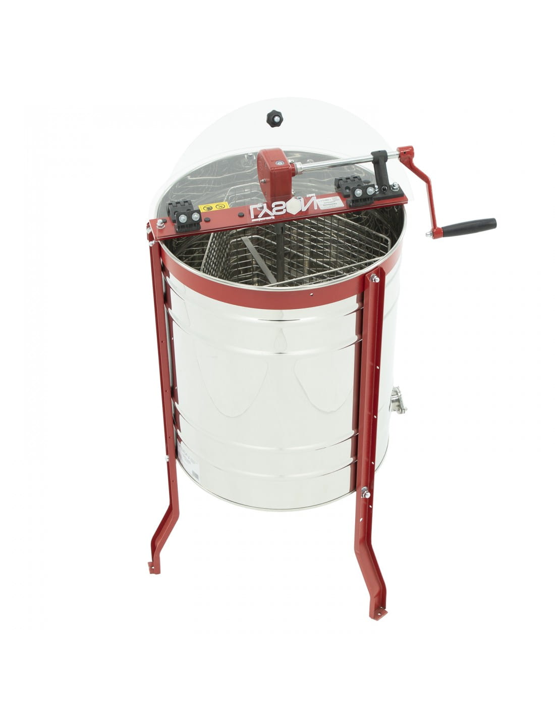 Pokrywa przeźroczysta, wykonana z meta-pleksu, dająca możliwość obserwowania procesu wirowania bez konieczności otwierania miodarki i narażania się na niebezpieczeństwo kontaktu z wirującym koszem.