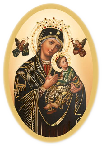 ✔️ Naklejka przedstawia wizerunek obrazu Matki Bożej Nieustającej Pomocy, patronki najbardziej smutnych i potrzebujących, którzy odczuwają silną potrzebę miłości i opieki. Najświętsza Maria Panna trzyma w ramionach Dzieciątko Jezus, towarzyszy im Archanioł Michał oraz Archanioł Gabriel