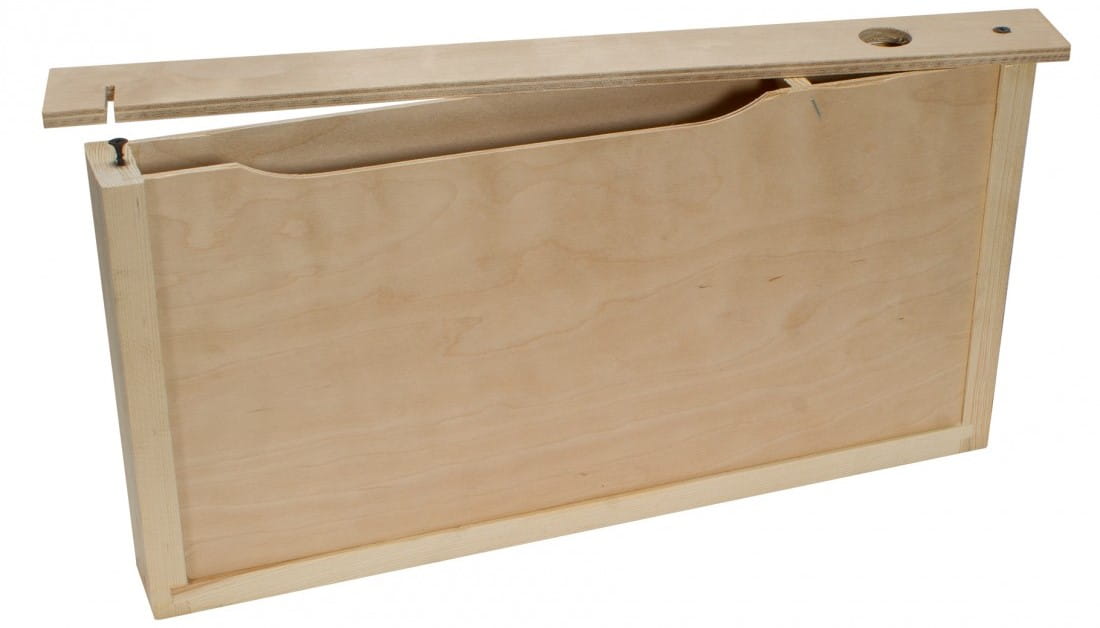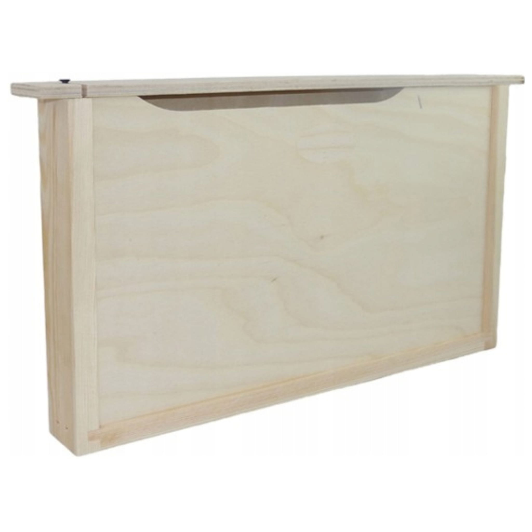 - Podkarmiaczka ramkowa do uli typu Dadant, o pojemności 3,3 litra. Wykonana została z drewna.