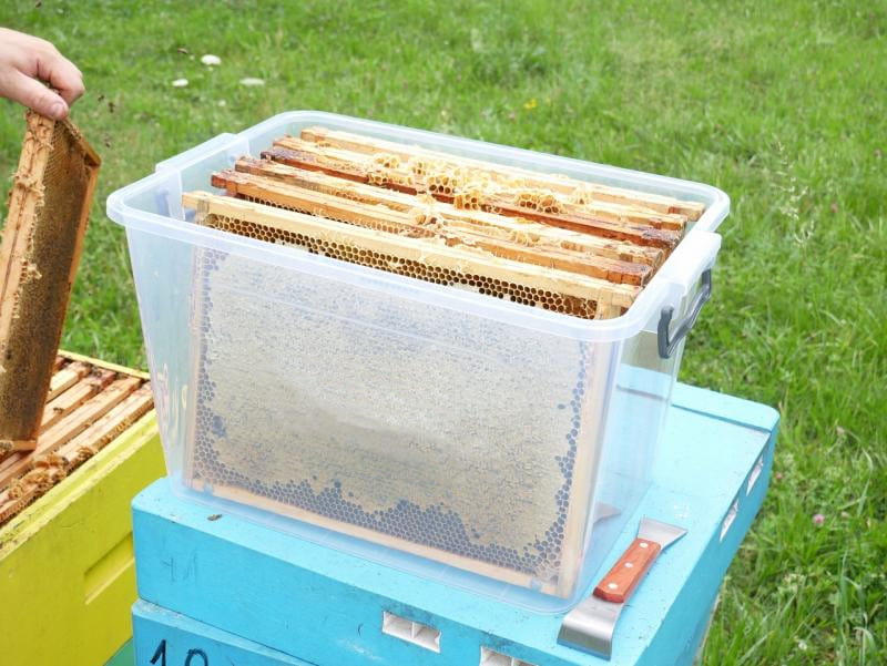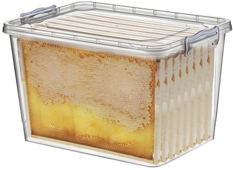 - Pojemnik został wyposażony w 2 boczne uchwyty, które ułatwiają przenoszenie ramek z uli do pracowni (wirowanie miodu) w czasie miodobrania.