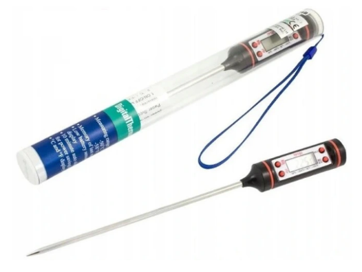 Elektroniczny termometr igłowy. Doskonale sprawdzający się w gastronomii. Wyposażony w etui, które chroni termometr przed uszkodzeniami mechanicznymi. Termometr posiada możliwość jego zawieszenia w dowolnym miejscu za pomocą sznurka lub przymocowania do paska za pomocą klipsa. Idealny do pomiaru temperatury mięs, potraw, ciast, ciecz itp.