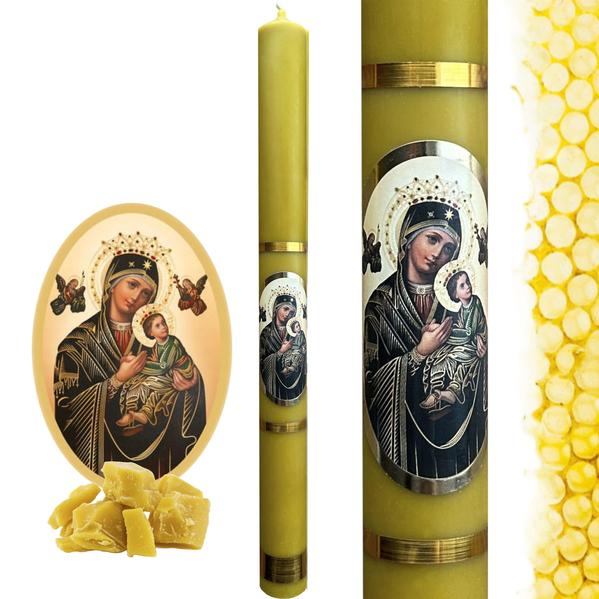 Świeca ozdobiona naklejką z Matką Boską Gromniczną i wykonana w 100 % z wosku pszczelego.