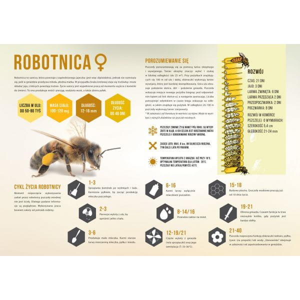 - rozwój, dietę, długość życia oraz pracę i zadania i pracę w ulu w poszczególnych dniach życia