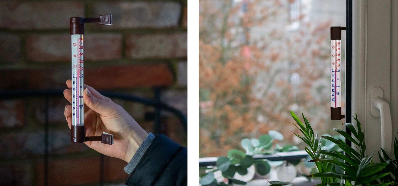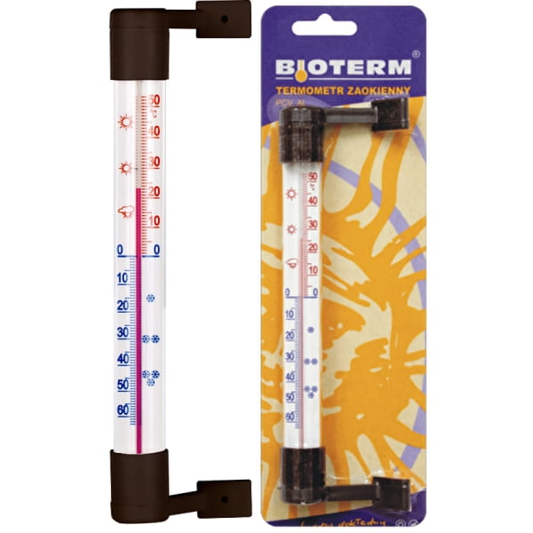 - Precyzyjny termometr zaokienny, wykonany z przezroczystego plastiku z brązowymi akcentami.