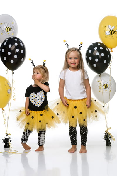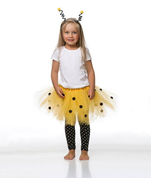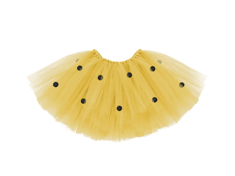- Spódnica tutu Pszczółka w kolorze żółtym w czarne kropki, z czarną tasiemką w białe kropki, obwód w pasie około 50 centymetrów, długość około 25 centymetrów.