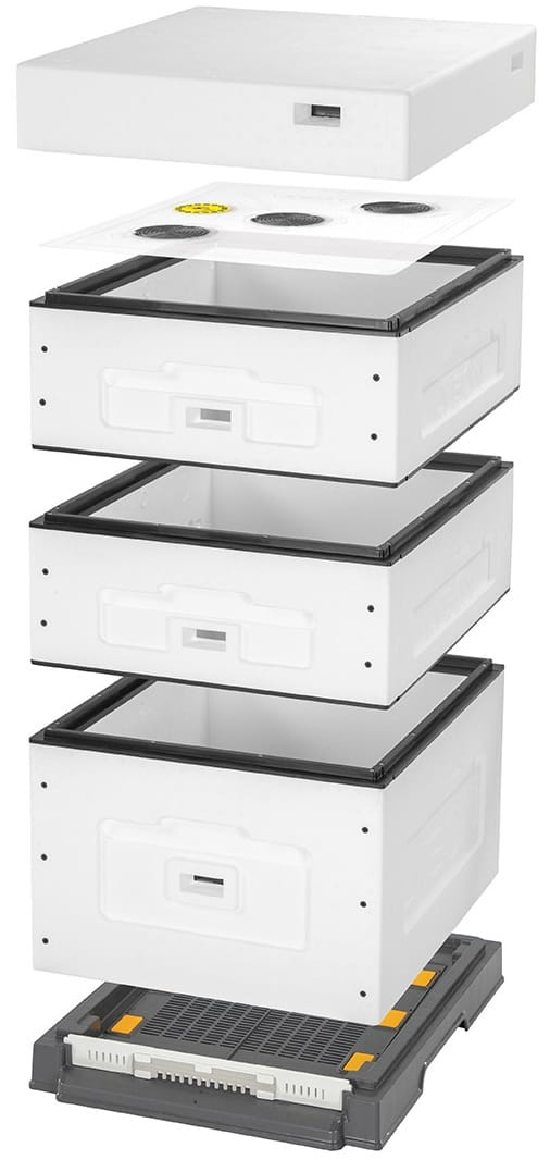 - Utwardzony styropian bardzo dobrze izoluje, a przy tym ule z niego wykonane są lekkie, co w przypadku pasiek wędrownych ma duże znaczenie. Należy zawsze pamiętać o zapewnieniu dobrej wentylacji. W tym celu, w elementach ula, takich jak korpusy, daszek czy dennica fabrycznie wykonano otwory, które zabezpiecza się korkami wentylacyjnymi z sitkiem (aby do ula nie przedostały się szkodniki) lub zamyka zaślepkami (czyli korkami styropianowymi).