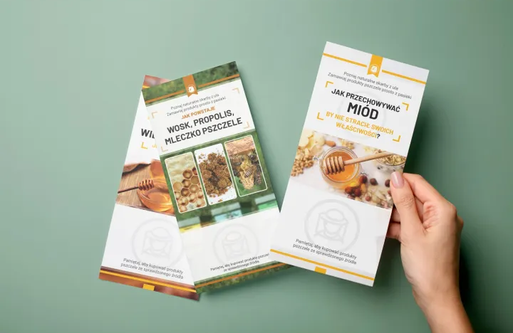 - Personalizacja – każda ulotka posiada dedykowane miejsce na pieczątkę, dzięki czemu klient zawsze będzie miał pod ręką kontakt do Twojej pasieki.