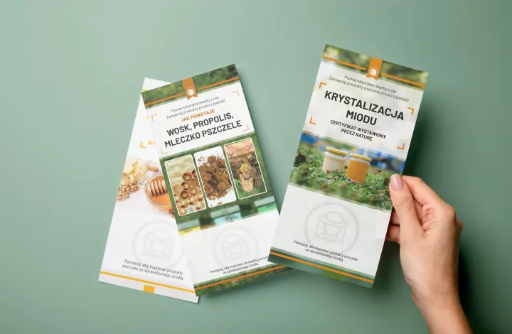 - Personalizacja – każda ulotka posiada dedykowane miejsce na pieczątkę, dzięki czemu klient zawsze będzie miał pod ręką kontakt do Twojej pasieki.