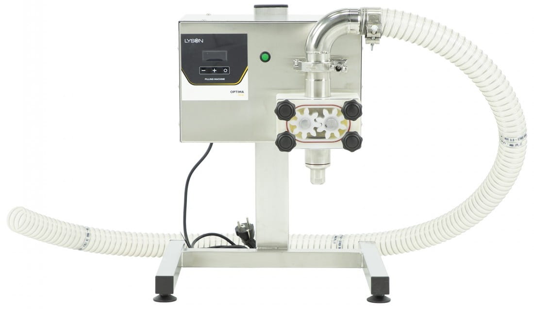 - Dodatkowa funkcja urządzenia, umożliwia dozowanie surowca. Ustawienie to polega na zastosowaniu wagi jako wzorca ilości miodu w pojemniku. Sterownik zapamiętuje czas napełniania określonej wagi i dozuje w ilości zaprogramowanej. Można zaprogramować 2 różne ilości miodu. Urządzenie zapamiętuje ilość napełnionych pojemników. Prosta regulacja wysokości mocowania urządzenia pozwala na napełnianie typowych pojemników szklanych.
