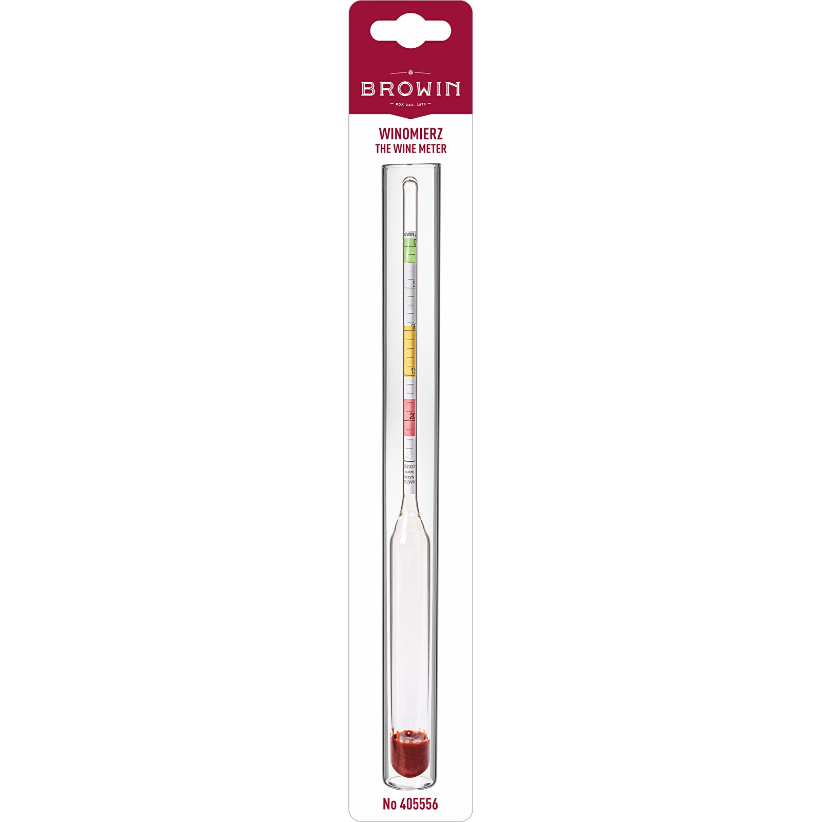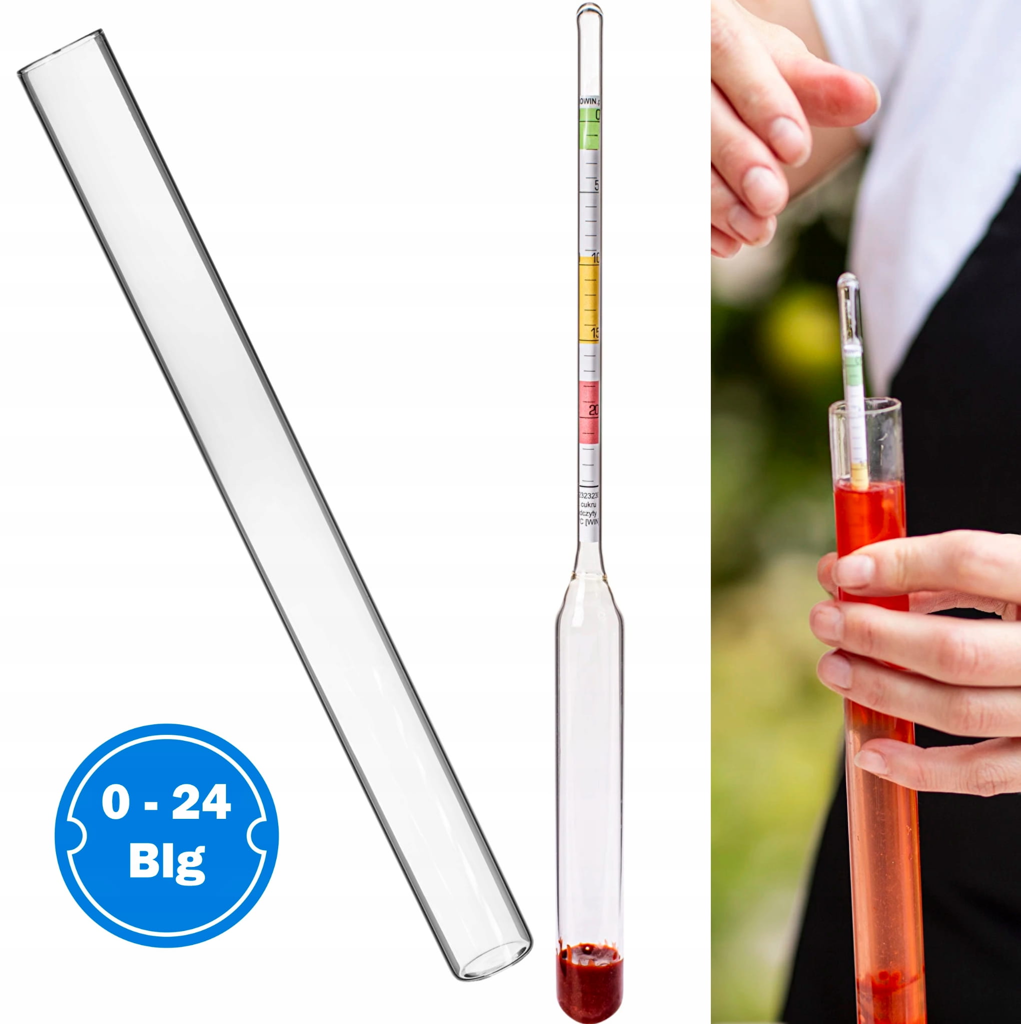 - Do pomiaru cukru i określenia potencjalnej zawartości alkoholu - areometr przydatny przy nastawach winiarskich i brzeczce piwnej, zakres: 0 do 24°Blg.