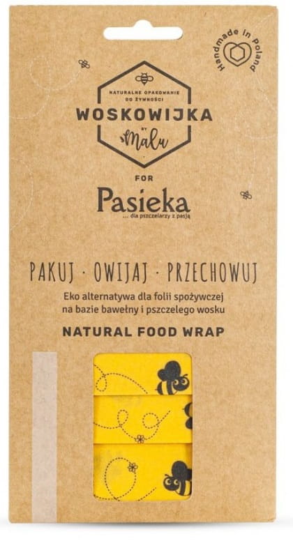 - Skład: Organiczna bawełna z certyfikatem – najwyższy standard w branży tekstylnej, oczyszczony wosk pszczeli, żywica sosnowa i olejek jojoba. Dzięki naturalnym właściwościom wosku i żywicy woskowijki przedłużają świeżość produktów i działają antybakteryjnie.